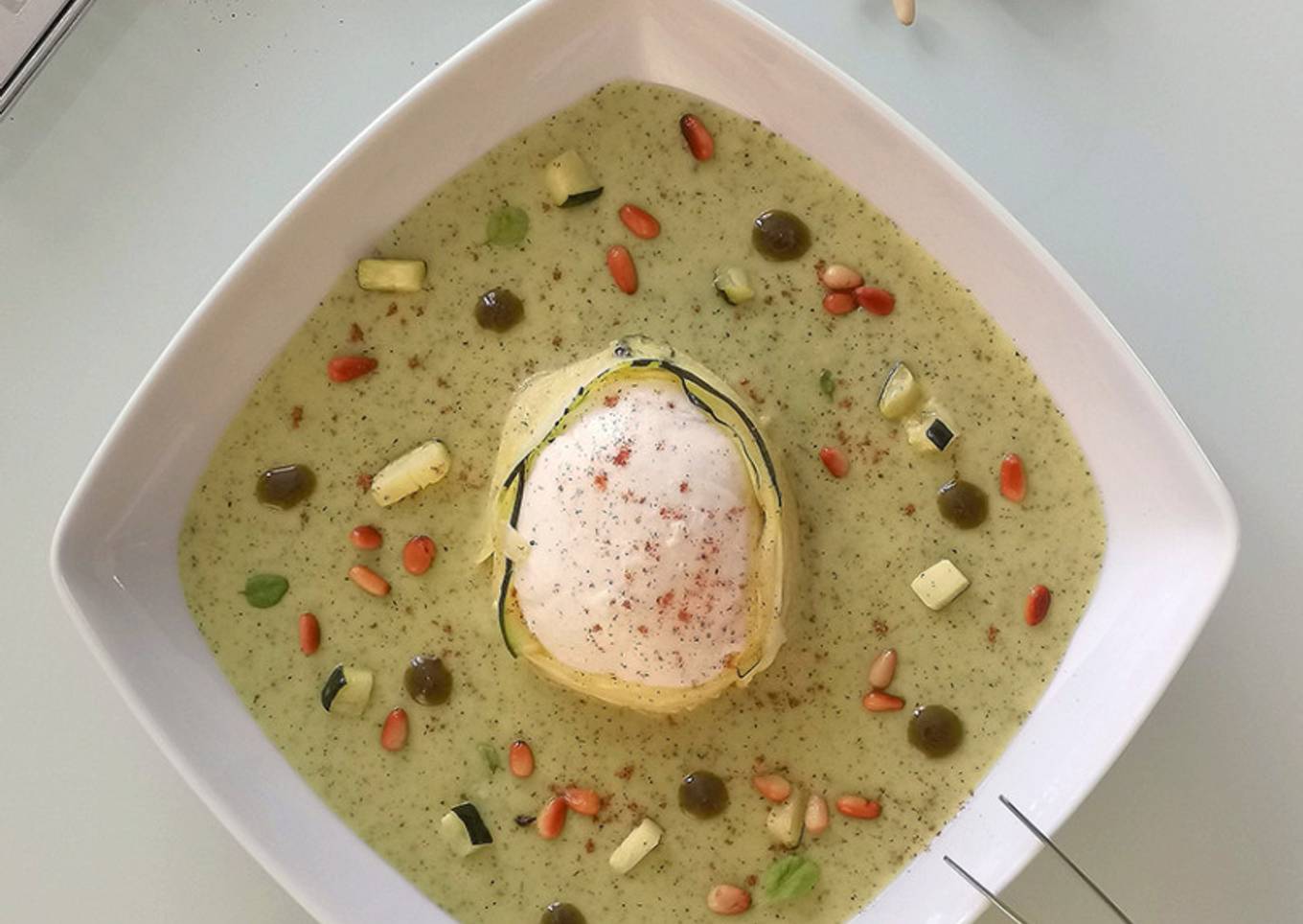 Trituramos el calabacín. Si es necesario agregamos más caldo de verduras. Si queremos una crema, agregamos nata y queso rallado. Volvemos a mezclar todo con la batidora a mínima potencia - Montamos nuestro plato con las láminas de calabacín envolviendo la bola de mozzarella fresca. Servir la crema en un plato hondo y dejar caer los trocitos de calabacín y piñones.