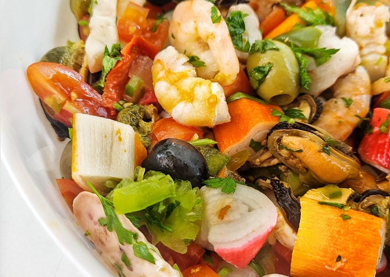 - Corta el pimiento, la cebolla, y el tomate muy fino. Colócalos en un bowl y añade las aceitunas enteras, también puedes trocearlas. Incorpora los mejillones, el surimi cortado y los langostinos algunos enteros y otros cortados a la mitad. Condimenta con sal, pimienta y revuelve. Aparte une el aceite y el vinagre, bátelo enérgicamente y viértelo sobre la mezcla. Añade el perejil y revuelve nuevamente. Rectifica los sabores.