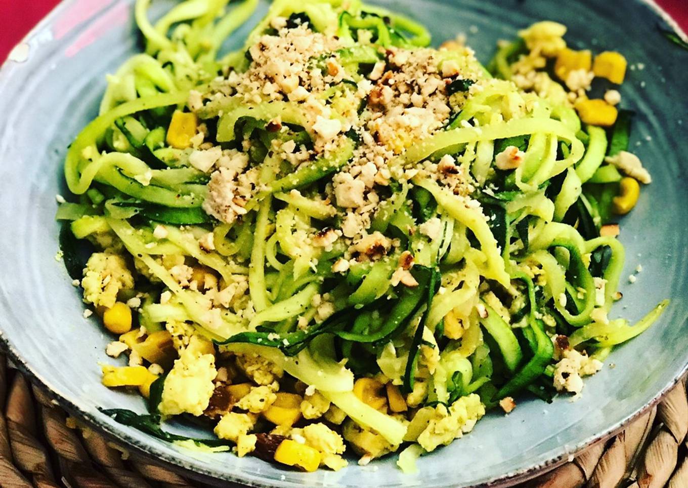 Tallarines de calabacín al curry de pollo con topping de anacardos