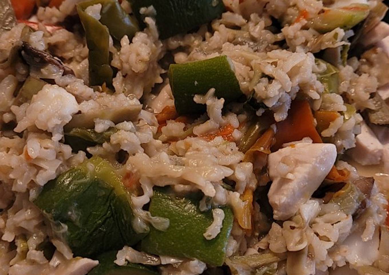 Arroz integral meloso pollo, champi y verduras con Thermomix