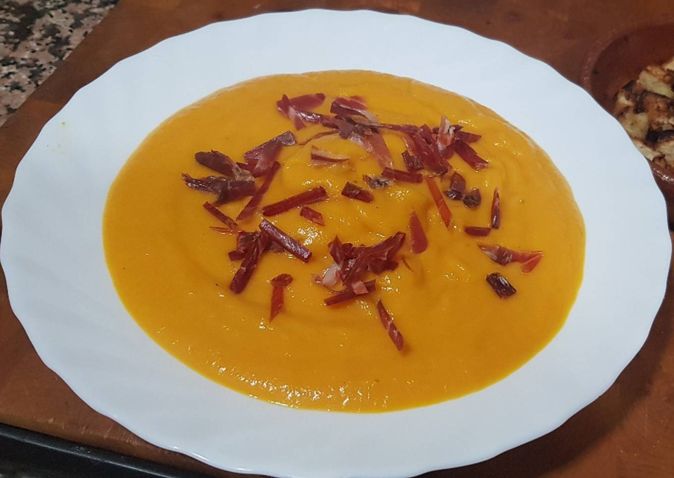 - Cogemos el jamón, cortamos en trocitos pequeños. Servimos la crema en un plato y espolvoreamos con las virutas de jamón. Acompañamos con el pan tostado.
