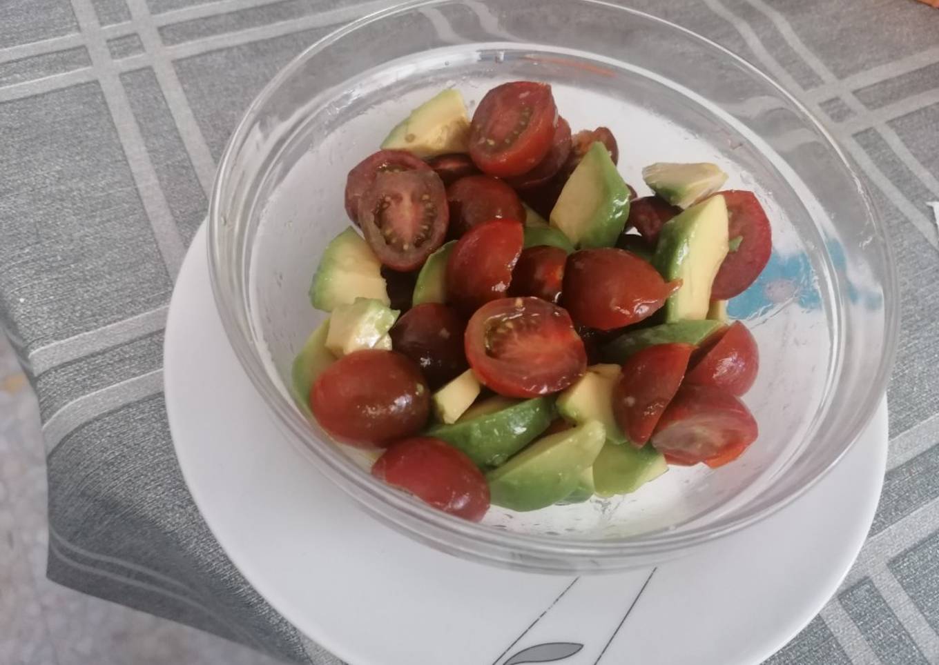 - Empezamos cortando por la mitad los tomates cherry y lo introducimos en un bol. A continuación pelamos el aguacate y lo picamos y lo agregamos a los tomates.
