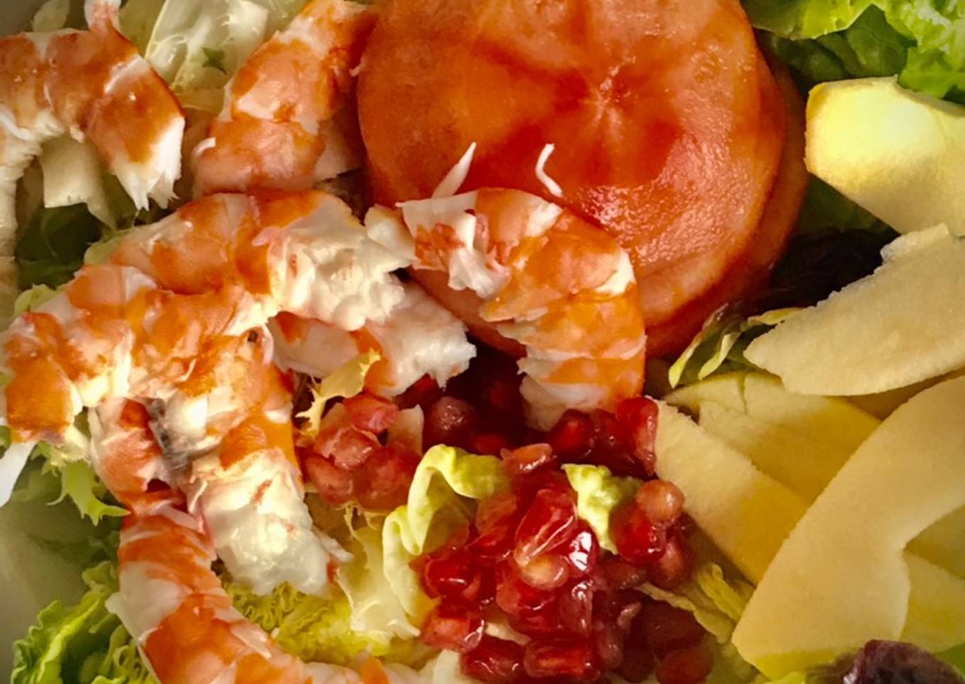 Instructions to make to make Ensalada con langostinos, manzana y granada