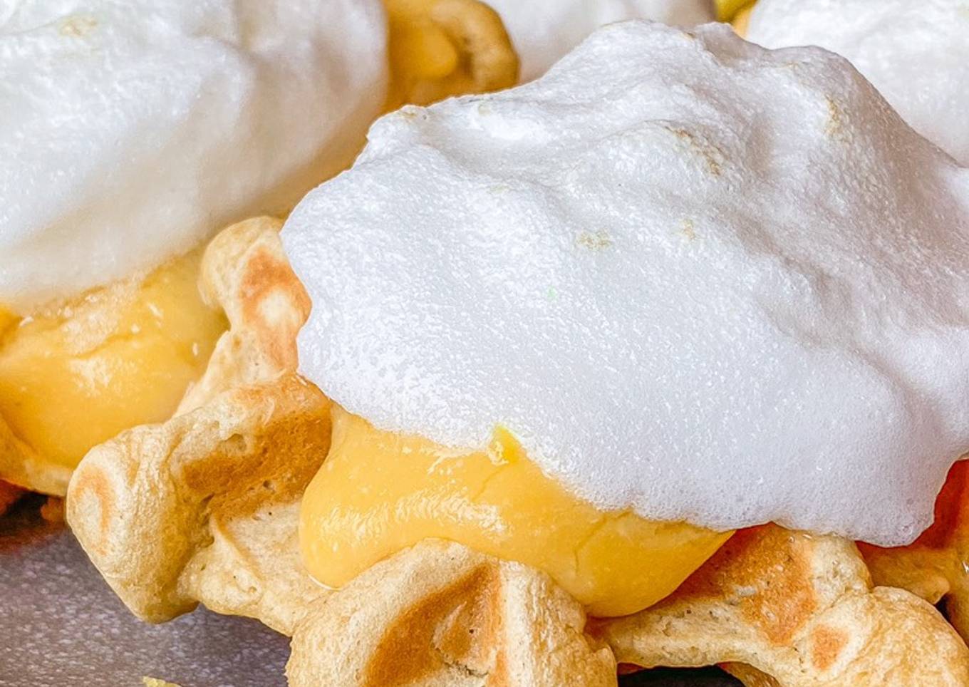 - Vertemos el curd sobre nuestros gofres, encima el merengue, lo tostamos con un soplete (opcional) y ¡a disfrutar!