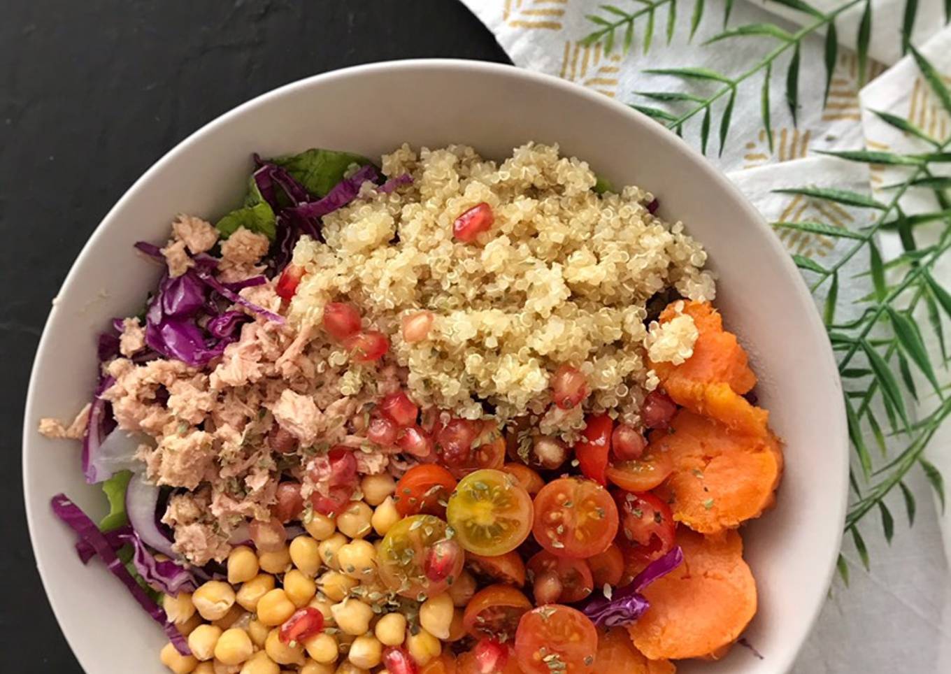 - Montar el plato junto con la quinoa ya cocida y el boniato asado en el horno. Abrir una lata de atún y añadir en el plato.