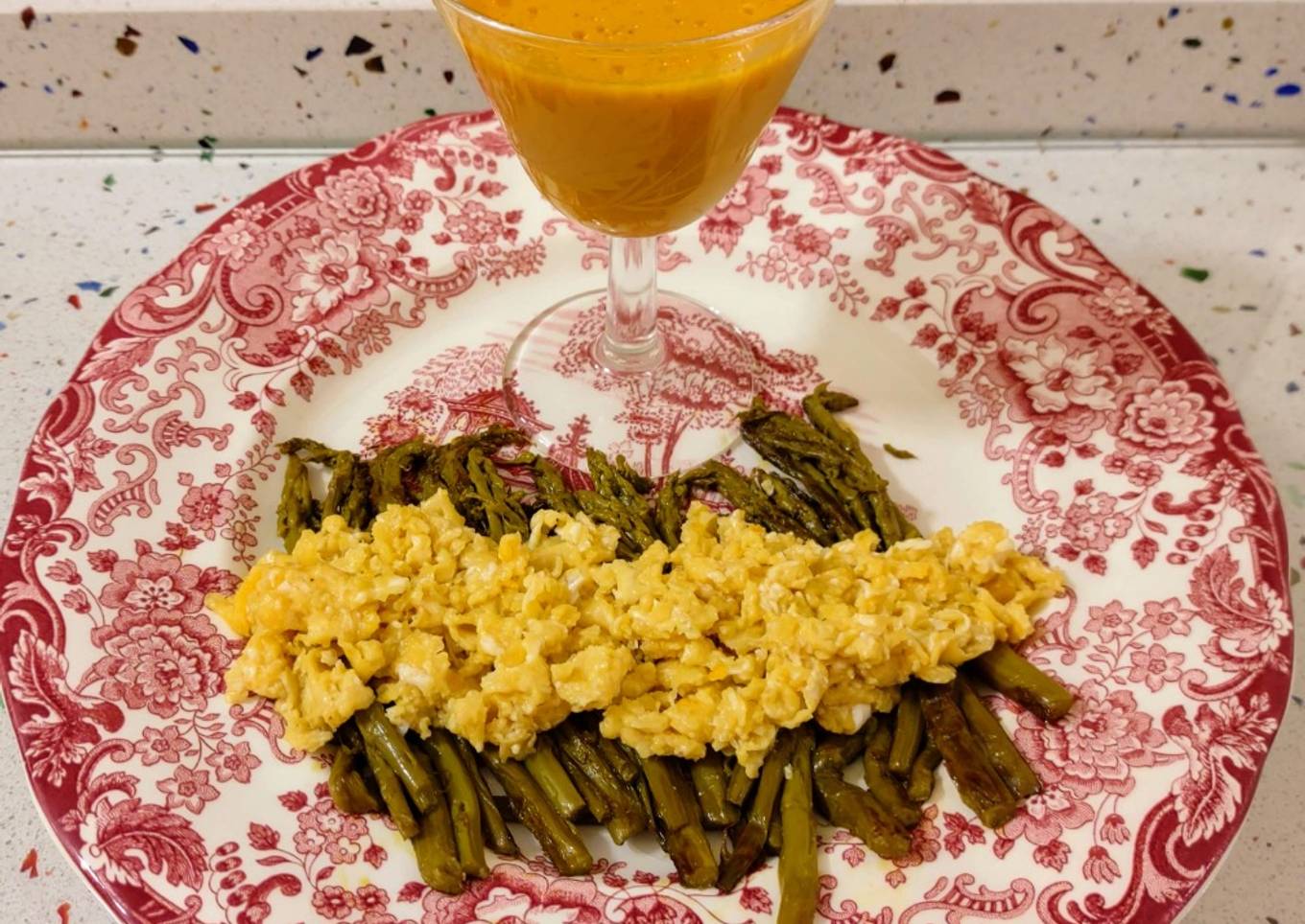 Revuelto de espárragos y crema de calabaza