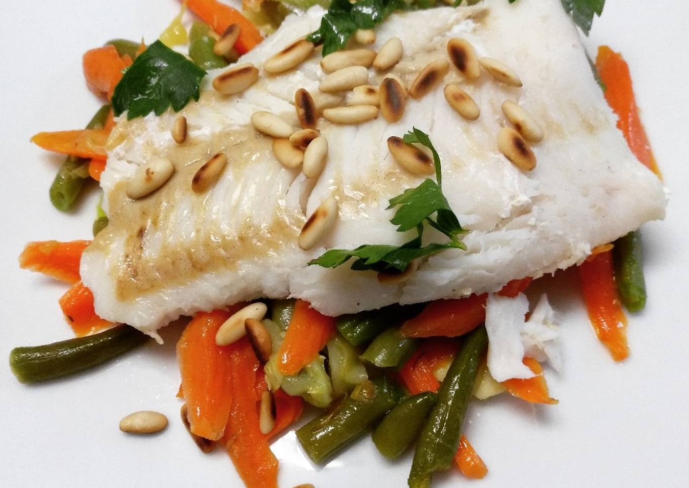 - Lavar los filetes de merluza sazonarlos y cocerlos al vapor durante 6 minutos. Se sirven enseguida con las verduras, los piñones y el perejil por encima y a disfrutarlo.