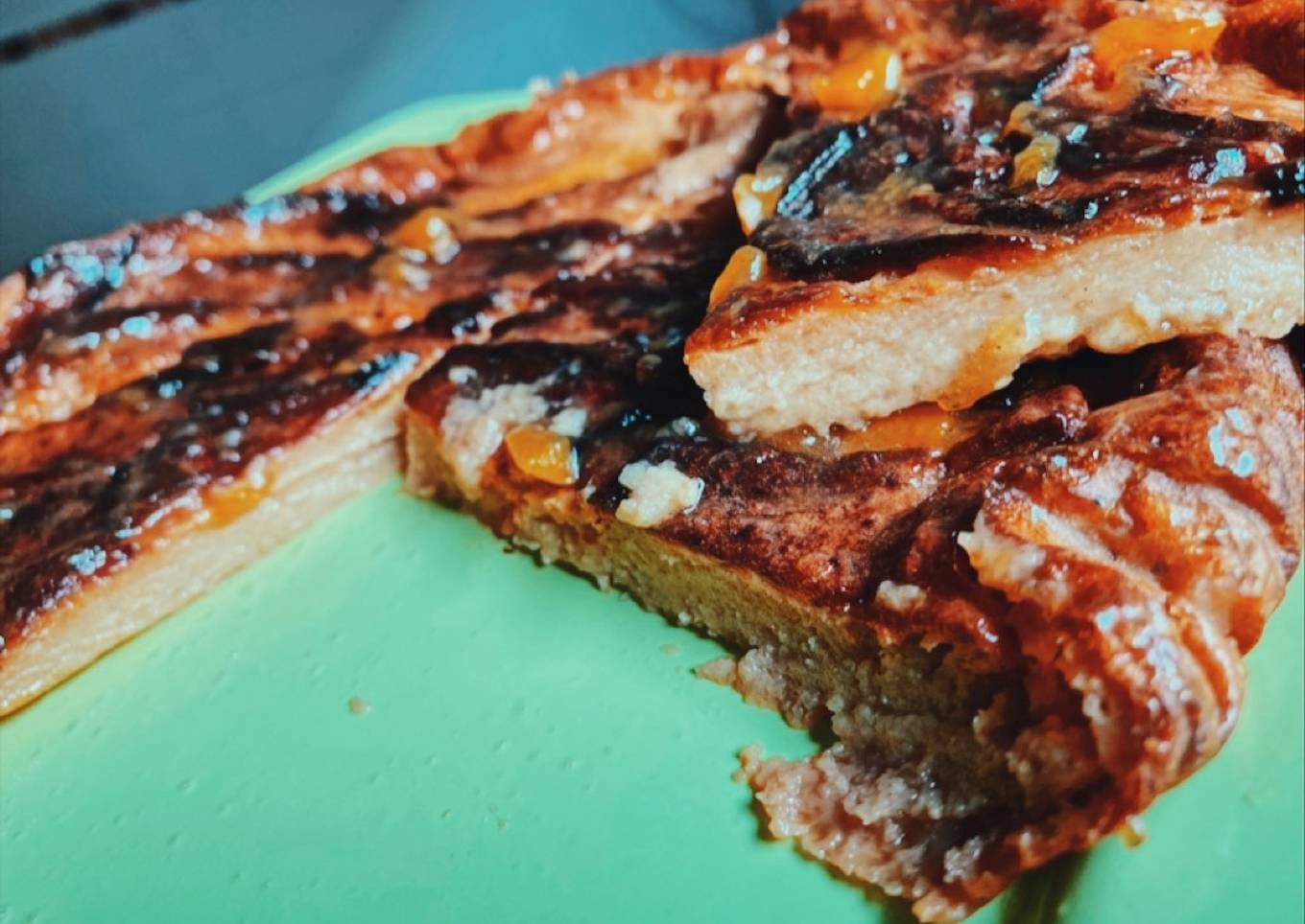 - Colocar en el molde, poner encima la manzana que habíamos laminado y reservado