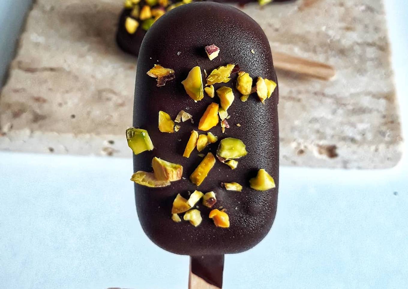Derretimos el chocolate y bañamos nuestros helados, esparcimos pistachos por encima para que se queden pegados, volvemos a guardar los helados en el congelador unos 15 minutos para que el chocolate se endurezca bien.