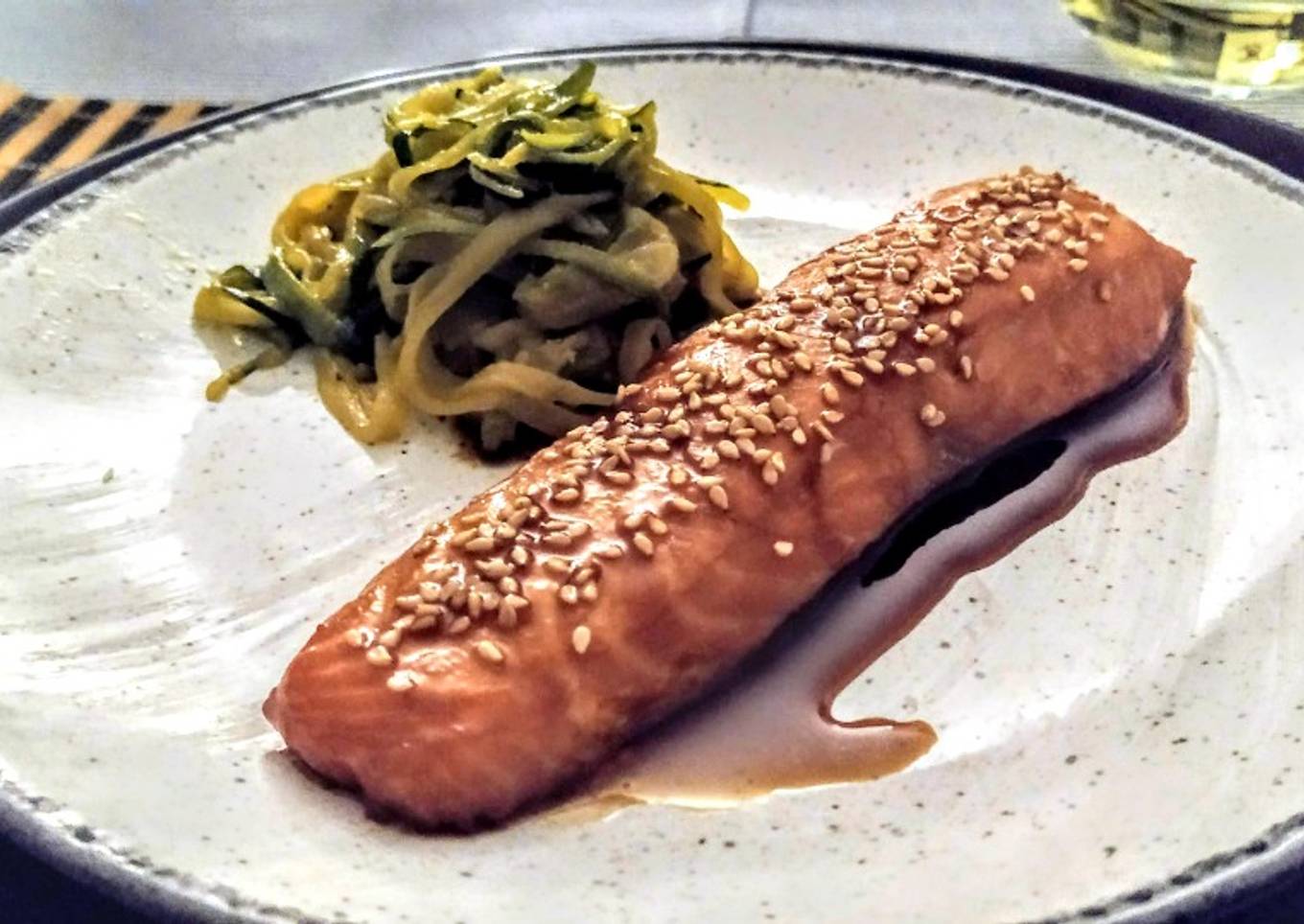 Salmón al horno marinado con soja y miel con tallarines de calabacín