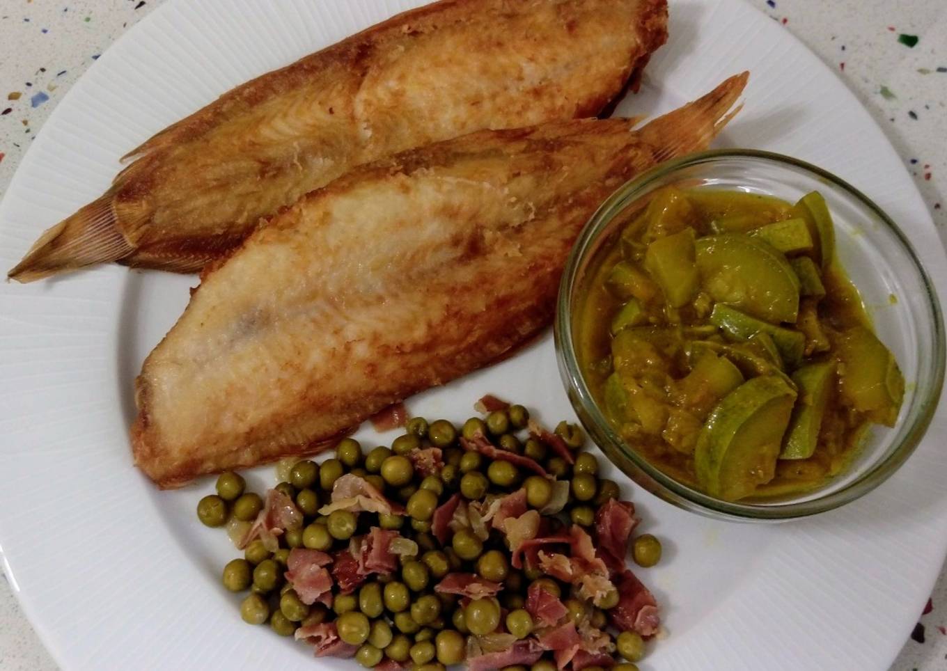 Lenguados fritos, salteado de calabacín y guisantes con jamón