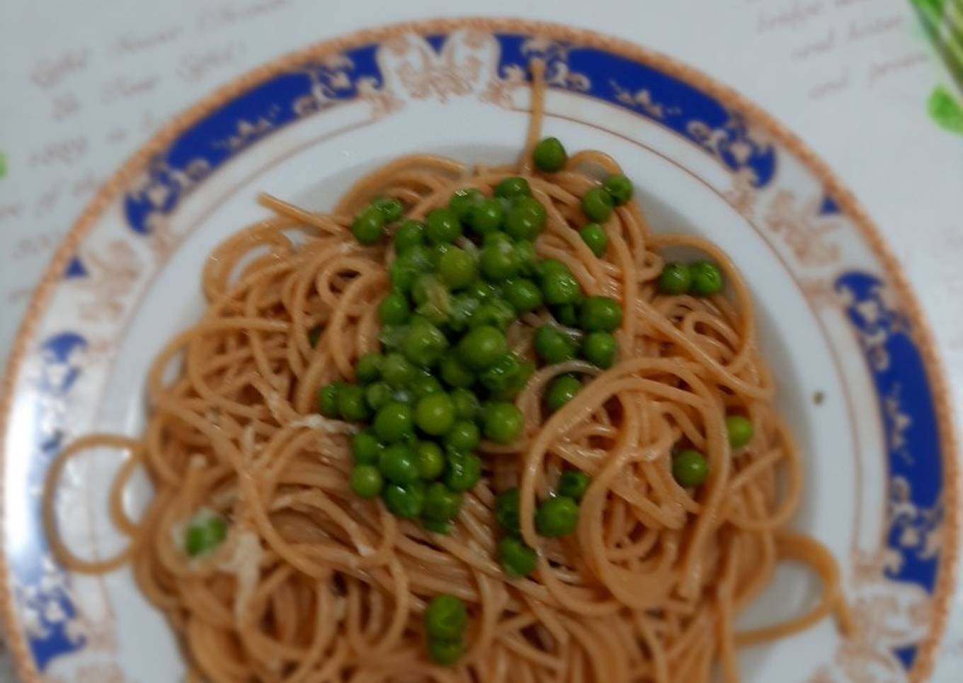 - Escurrir los espaguetis y mezclar con los guisantes y listo. Yo le vuelvo a echar queso parmesano pero eso depende de cada uno. Que aproveche!