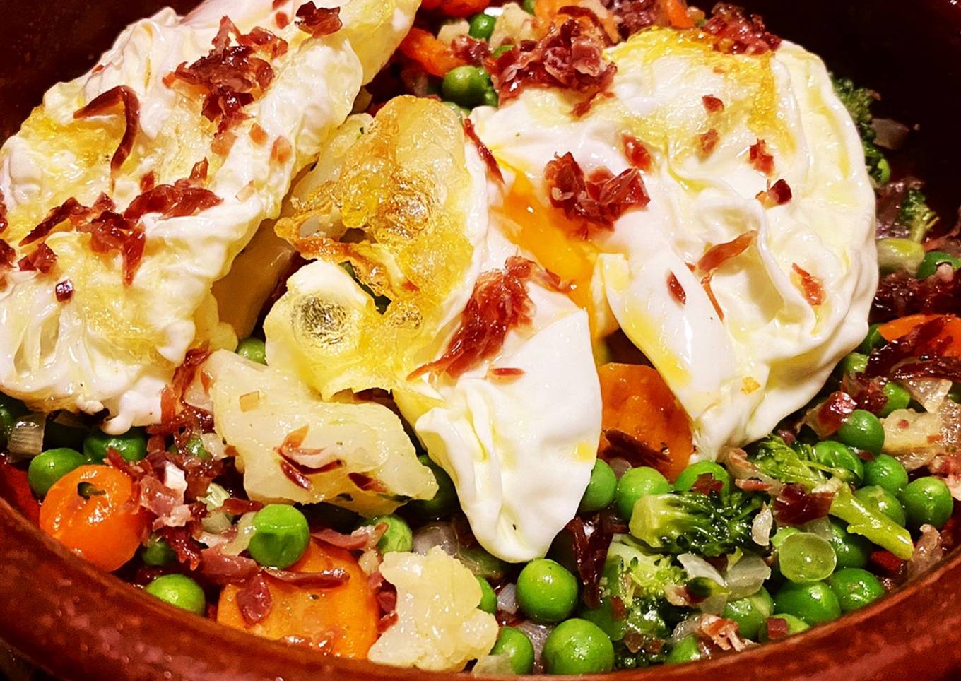 - Añade el jamón ibérico y saltea otra vez. Después fríe un par de huevos con su puntilla y coloca sobre la menestra. Termina decorando con un poco más de jamón ibérico y a disfrutar 🥳