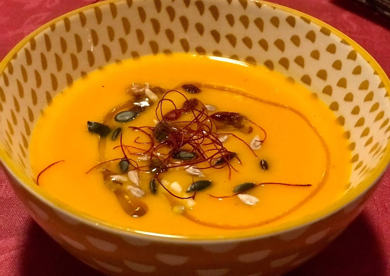- Condimenta con sal y pimienta, curry y cominos. Decora con las pipas, el cabellin picante y el aceite de oliva