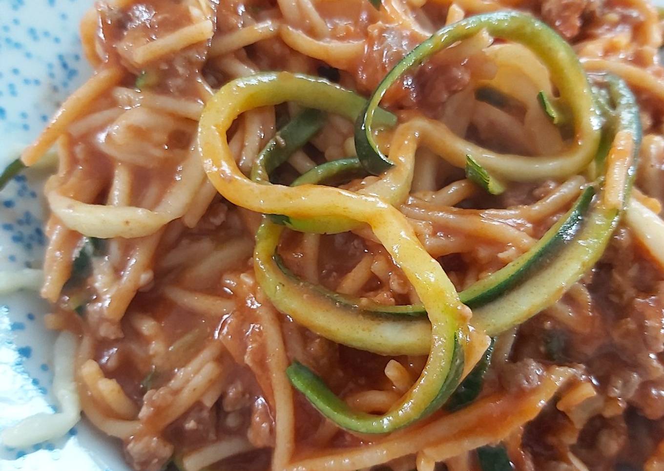 Espaguetis integrales con boloñesa de ternera y calabacines