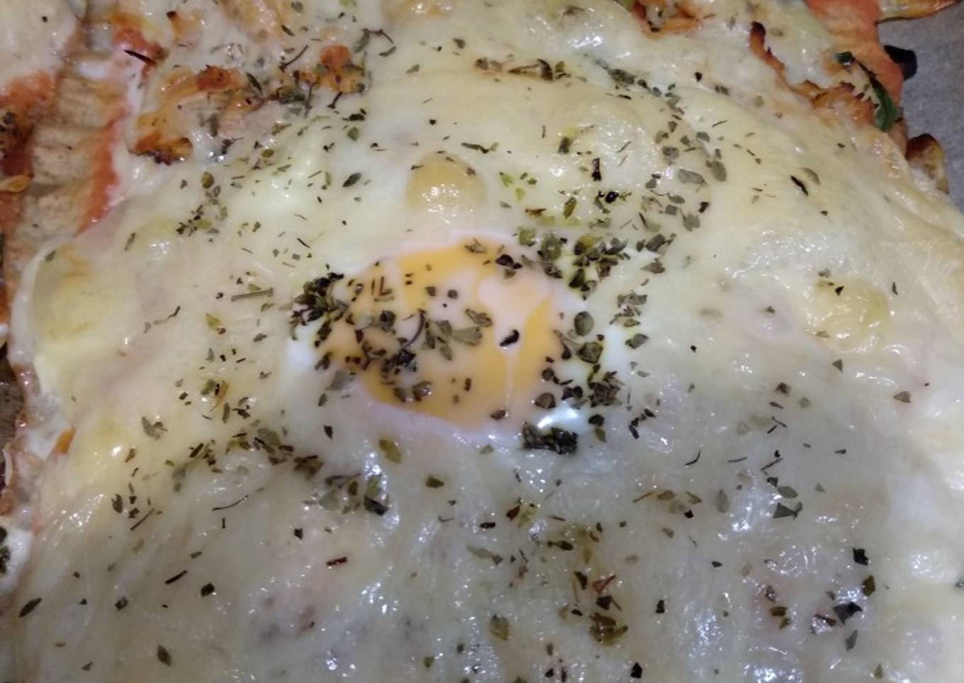 - En la otra mitad de la pizza añadimos queso philadelphia en la base, salmón ahumado, el queso proteico y orégano. Podemos añadir un huevo en mitad. Rociamos con un poco de AOVE y lo metemos al horno.