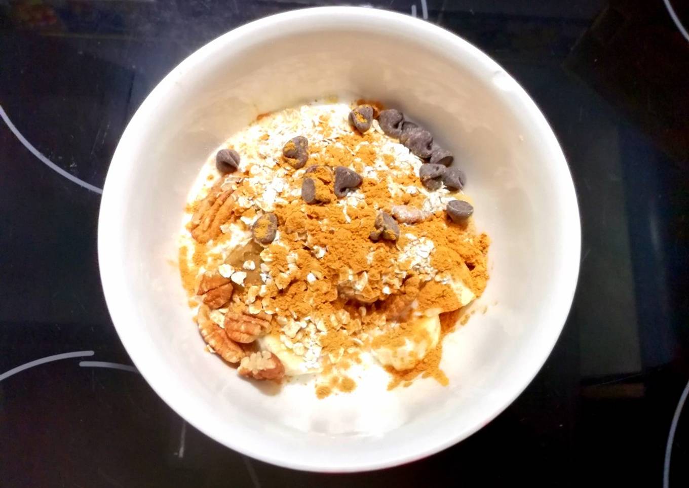 - Pon los ingredientes en el orden descrito y mezcla bien para disfrutarlo todo junto!! El puñado de frutos secos se calcula con la mano cerrada sin que sobresalga ninguno